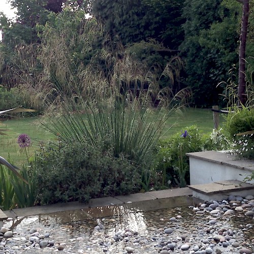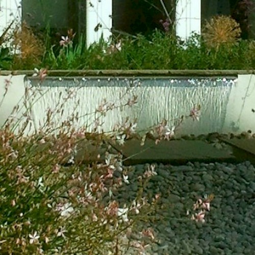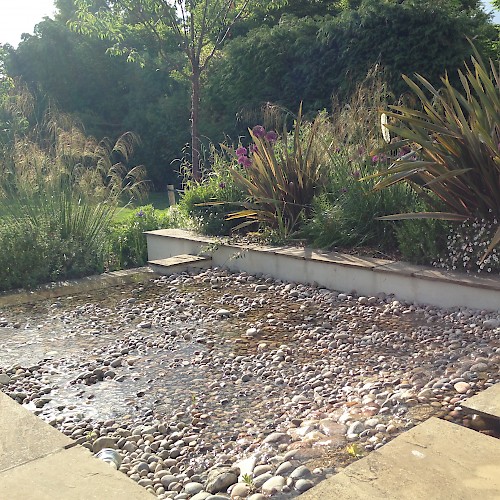 The clients were keen to have a water feature but were concerned about the safety aspect of having any significant depth of water: a contemporary 'stream' resolved this issue.