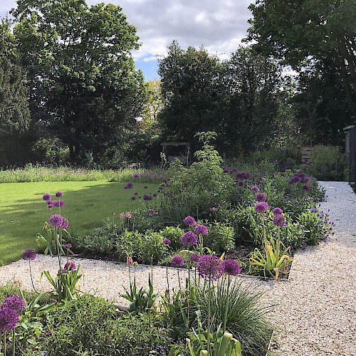 A kitchen garden with raised borders is positioned towards the end of the garden. A wildflower meadow separates the formal lawn from the orchard at the rear.