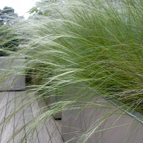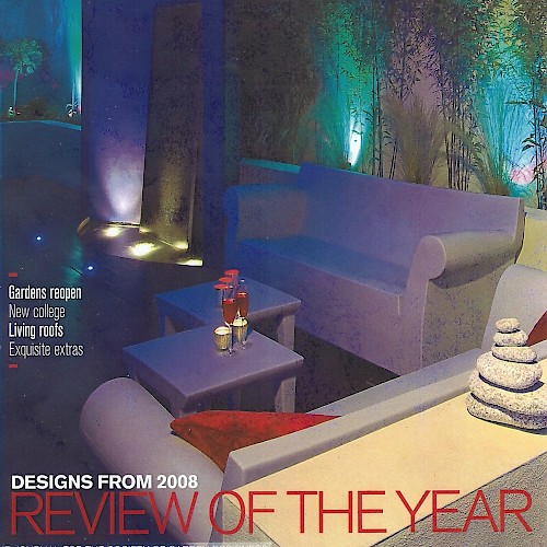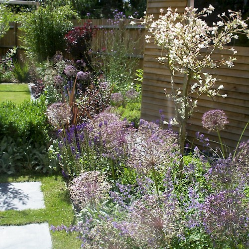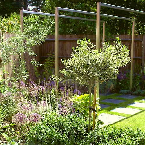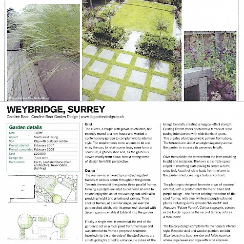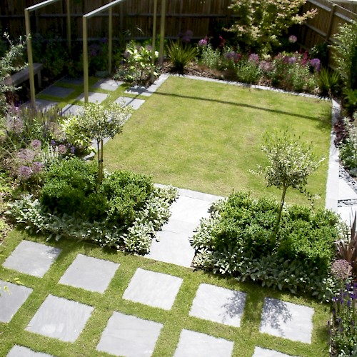 This was a blank canvas with lawn laid right up to the fenced boundaries, with no planting and was overlooked. The design incorporated a steel pergola to provide a degree of a privacy and the new lawn was laid diagonally across the garden to make it appear longer. Being a town garden most of the windows were at first or second floor level and the view from above was important, hence the strong pattern of the paving interspersed with grass, and the green living roof on the garden shed. This garden featured in an article entitled Review of the Year 2008 in the journal for the Society of Garden Designers.
